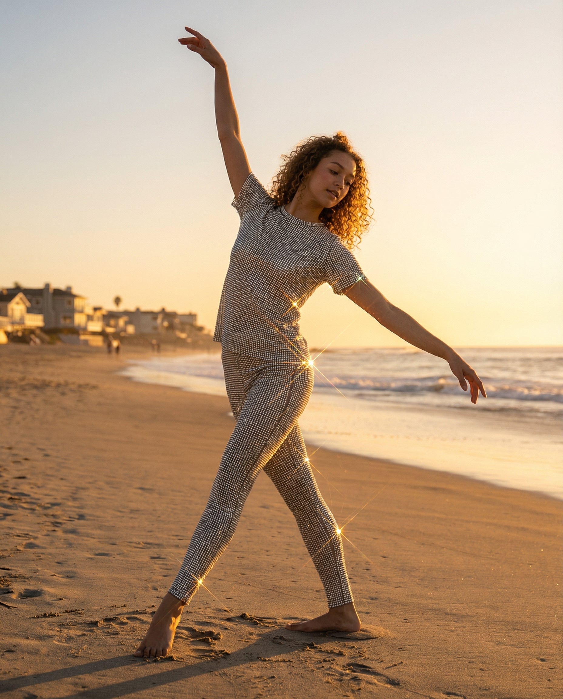The high-waisted compression fit sculpts and supports while you conquer your day, and the dense rhinestone grid provides 100% opacity for total confidence. Squat-proof, sweat-proof, and impossibly radiant. This is what power looks like.